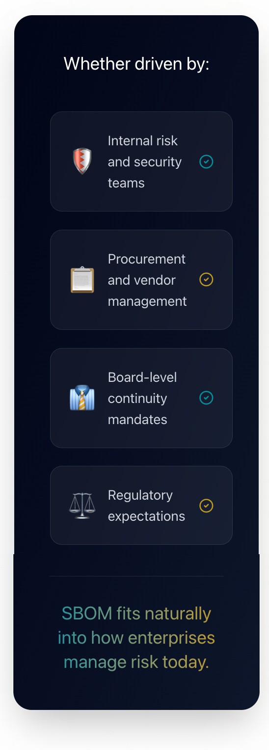 SBOMs maintained as part of structured escrow documentation—ready for reviews and audits.